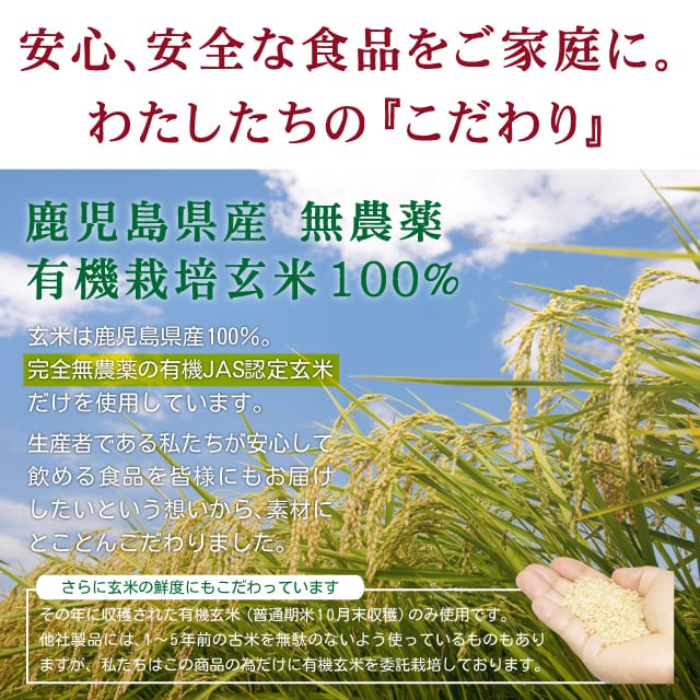 鹿児島県産の無農薬・有機JAS認定栽培玄米のみを使用。